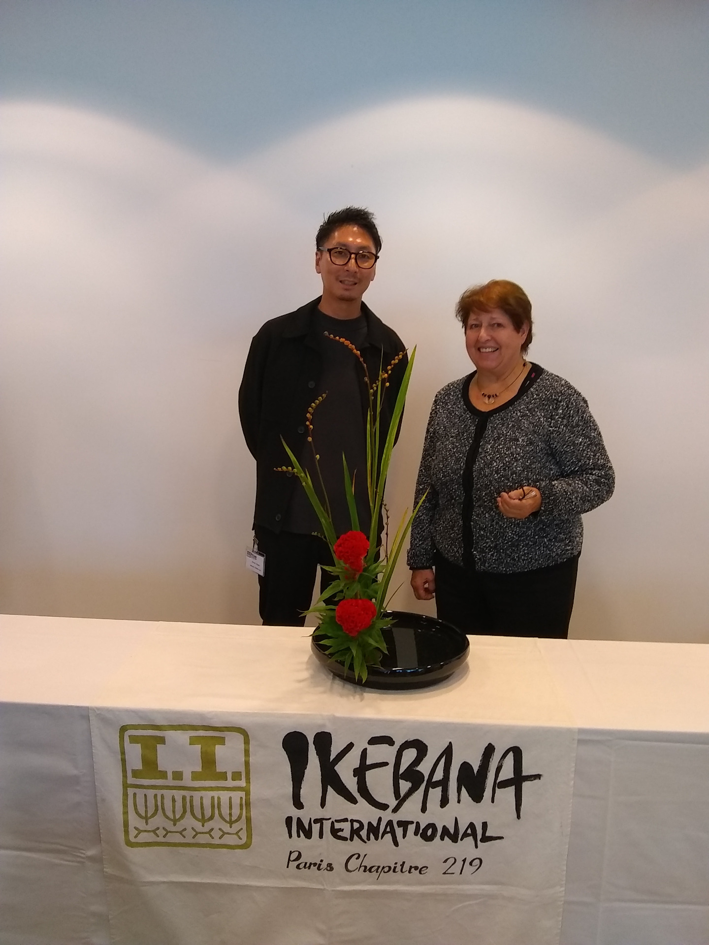 Votre animatrice avec le iemoto de l'école Ohara, à Paris, le 16 octobre 2025, lors de l'atelier ikebana pendant lequel un tateru-katachi a été réalisé pour le plaisir d'une quarantaine de personne.